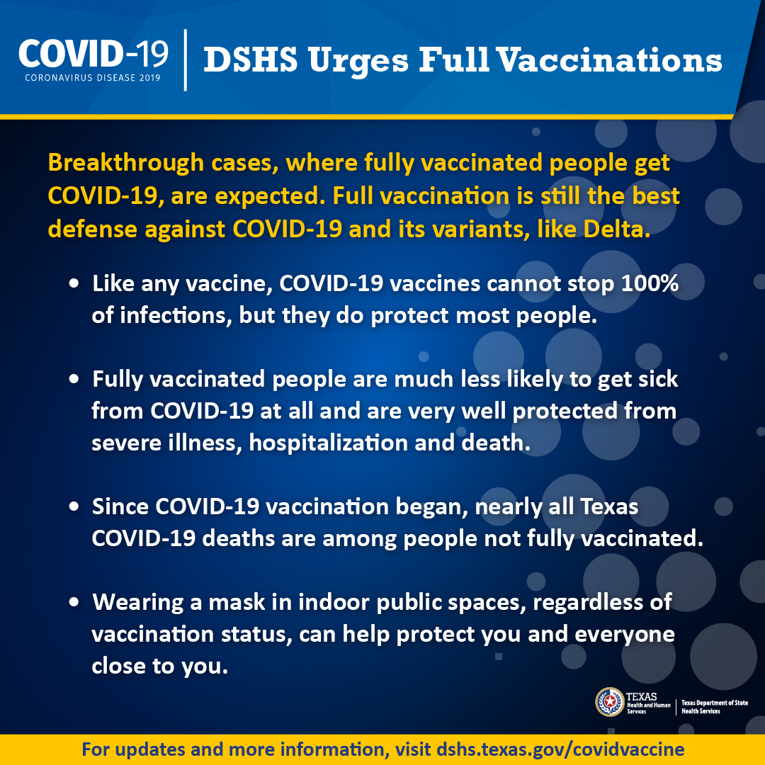Texas Dshs On Twitter As Breakthrough Cases Are Reported Dshs Continues To Urge Full Vaccinations Full Vaccination Is The Best Defense Against Covid 19 And Its Variants Like Delta Since Vaccination Began Nearly